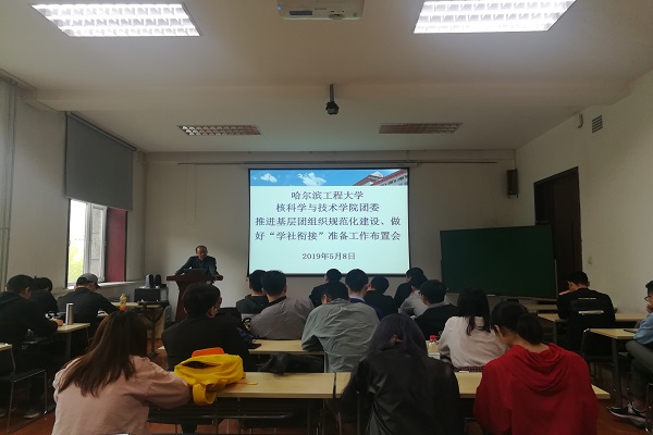 为落实校团委《关于推进基层团组织规范化建设、做好“学社衔接”准备工作的通知》的要求,5月8日核学院团委在31号楼370教室召开学院推进基层团组织规范化建设、做好“学社衔接”准备工作布置会,院团委书记李灵东主持会议,学院团委学生干部、团支部干部等参加会议。