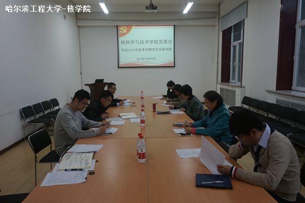 10月26日下午,核科学与技术学院党委在31号楼343室召开党委会,审议2015年秋季学期党员发展对象。会议由党委书记郭黎滨主持,学院院长夏虹,党委副书记田凯,副院长高璞珍,党委委员曹欣荣、赵强出席会议,学工办主任...