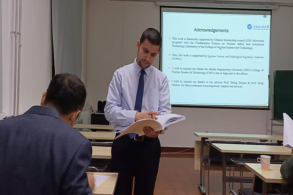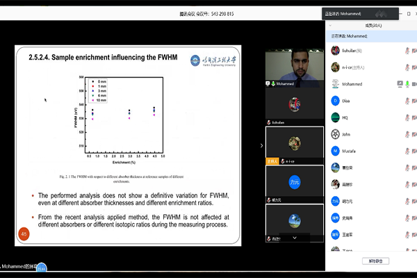 Khaled提前将答辩演示文稿录下,由答辩秘书发给所有答辩委员。学院还专门邀请2位专家,协助学院学术委员会审查他的论文。3月23日下午1时,凯立德在埃及通过腾讯会议软件进行了在线视频答辩。答辩委员会主席由核学院曹欣荣教授担任,委员由兰州大学张红强教授以及我校王建军教授、曾和义教授、张萌副教授组成。凯立德围绕其学位论文《基于伽玛能谱的铀浓缩测量研究》进行答辩报告,并就答辩委员会专家提出的问题作答。经过充分讨论,答辩委员会无记名投票表决,答辩委员会认为凯立德的论文达到了工学博士学位论文的水平,一致同意他的博士学位论文通过答辩,同意凯立德毕业,并建议授予其工学博士学位。
