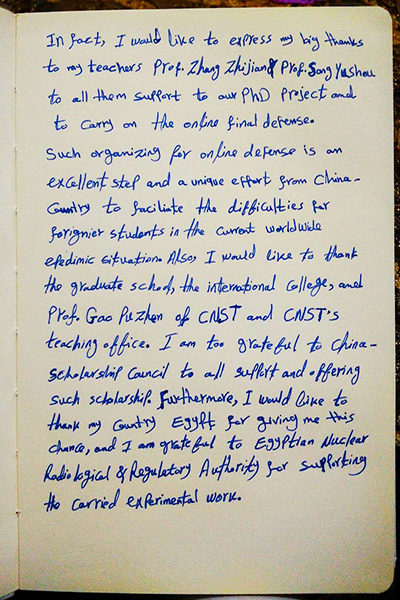 Khaled表示,感谢学院和学校的培养,他才能获得许多科研经验。在老师们和朋友们的帮助下,他战胜了好多困难,同时也收获了友谊。唯一的遗憾是不能在现场与导师、答辩委员会老师们合影,希望日后有机会能来中国弥补这一遗憾。Khaled 还在发给学院教务秘书的信息中写到,“非常感谢您,我会一直记得您和学校里既优秀又乐于助人的老师们,感谢你们在科学领域以及日常生活中给我留下美好的回忆”。