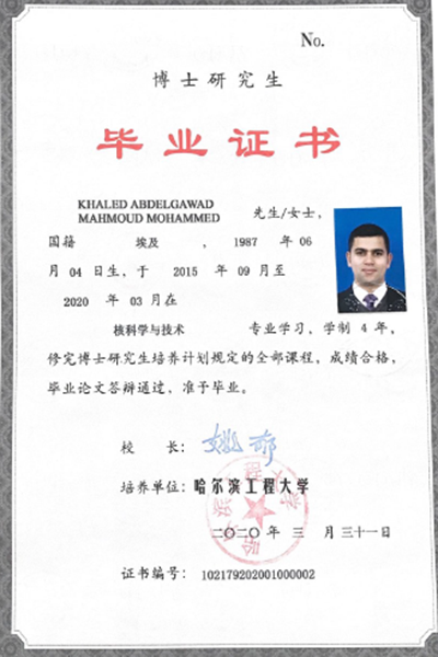 这几天,埃及开罗的阳光很灿烂,我校核学院2015级博士留学生Khaled脸上的笑容更灿烂,因为他获得了梦寐以求的博士毕业证。