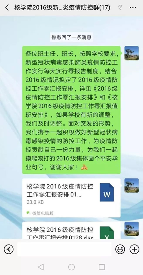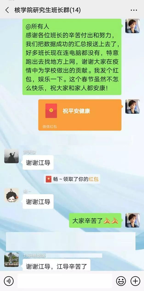 疫情防控工作开展以来,核学院辅导员江凌一直坚持在一线,工作不掉线,大年三十依然密切关注疫情,向学生传达有关疫情的防控信息。在自己本身高烧38℃的情况下,居家隔离中仍然紧张的开展工作,统计好所有学生的准确所在地、身体健康状况和武汉接触史,连在职的非全日制学生都一个不落,确保信息无死角,为防控工作提供准确的信息。建立了湖北籍学生临时工作群,了解湖北学生回家的时间路线和学生身体状况,跟学生经常聊天,关心学生的身体和心理状况,缓解学生的紧张情绪。研究生群体由于分散性强,流动性大,类别繁多,情况十分复杂,管理起来尤为困难。研究生班长发挥了重要的核心作用,尽职尽责的第一时间发布通知给同学,统计所有同学的防控信息。由于适逢过年,很多班长返乡并没有携带电脑,上网不便,走出几公里到镇上网吧上网统计数据,非常辛苦。但是他们不怕苦不怕累,第一时间采集整理好信息发给辅导员,为学校防控工作提供一手准确数据做出了贡献。