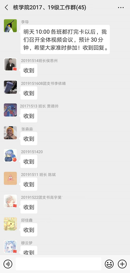 新冠肺炎疫情牵动着全国人民的心,疫情就是命令,防控就是责任。在这场疫情防控阻击战中,核科学与技术学院的全体辅导员在学院党委书记谭思超、副书记田凯的带领下,迅速响应号召,进入“战疫”状态。面对分布在祖国各地的1295名我院学生,他们放弃休息,绷紧神经,每天对每名学生身体状况进行精准摸排,做学生思想引领、心理疏导,整理转发疫情知识和科学防控方法……这些“战士”用实际行动全力保障防控措施落实,以点点滴滴工作践行守土有责、守土担责、守土尽责,为打赢疫情防控阻击战默默地贡献着自己的力量。