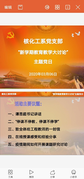 之后,薛云老师分享了自己在线授课的经验和感受,虽然做了充分的准备工作,并经过了前期在线试讲测试,但还是有些问题,经与智慧树技术人员沟通改进了授课时网络的顺畅程度,下周预计能实现双向语音功能,在本周授课时使用了一台笔记本电脑和2部手机,目前投票和头脑风暴功能课堂提问和统计比较方便,但只能在手机端发布,手机和电脑频繁切换不是很方便,且只能在开始授课之后才能发布,会浪费一定课堂的时间,有待进一步解决。党支部组织委员高杨老师向同学们了介绍了疫情期间核学院关于本科生及研究生教学的相关安排。马福秋老师就《致全体哈工程教师的一封信》结合习近平总书记提出的“四个引路人”,向老师和同学们介绍了疫情时期教师的责任及义务。