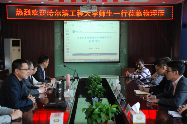 在物理所的大会议室中,赵弘韬所长首先代表全所职工对哈尔滨工程大学的来访表示了热烈的欢迎,然后对双方的出席人员情况进行了介绍。接着由国际学院丁学忠副院长发言,对此次来访参观的目的进行了说明。最后赵孝文副所长对物理所的概况进行了介绍。