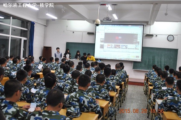 8月28日晚上18时30分,由核科学与技术学院学生会文艺部主办的“新生学唱校歌”活动在21B教学楼508教室举行,核学院大一辅导员新生李响老师、学生会主席杨广亮来到活动现场协调指挥,保证活动的顺利举行。18时30分,在新生收看纪录片《揭秘哈军工》告一段落后,核学院学生会文艺部副部长到讲台教授大一新生们学唱《哈尔滨工程大学校歌》,新生们致以热烈的掌声。在激昂向上的音乐旋律的伴奏声中,每名新生都体会到了 “大工至善、大学至真”的军工精神。在文艺部领唱的带领下,同学们开始一句一句地跟唱校歌,嘹亮的歌声飘出教室飘向远方。活动过程中,每名新生都一丝不苟地拿着自己手中早已写好的歌词,在哈军工校歌音乐伴奏下一句一句地练习,学唱数遍后,大一新生已经很好地掌握了《哈尔滨工程大学校歌》。随后,李响老师宣布活动结束,大一新生向领唱的学生会文艺部副部长们致以热烈的掌声表示感谢。