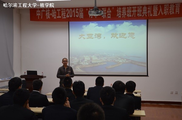 开班典礼由我院教务办李金阳老师主持,首先,我院党委书记郭黎滨教授为开班仪式致辞。他欢迎各位同学加入中广核集团,并肯定了广核集团在中国经济发展中起到的重要支撑作用。郭书记指出,准员工们要做好观念和角色转变,积极地投身到企业的培训中去。同时,郭书记还嘱托此次参加“订单+联合”培养的学生要诚信律己,具有强烈的社会责任和使命感,培养自己的科学精神和职业洞察力,并注重团队协作。“联培班在工程大学至今已走过15个年头,你们是有黄埔军校之称的订单+联合培养班的黄埔15期学员。"郭黎滨书记如是说道。最后,郭黎滨书记希望准员工锻炼好身体,完成本专业和联培班的学业任务,顺利入职。