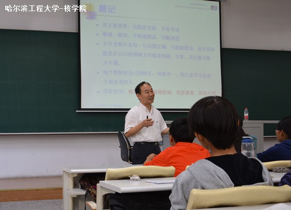 开讲之前,张志俭院长以题记的形式向新生强调了英语学习的目的是交流,不是考试,以及英语学习对以后专业学习和国际交流的重要性,同时鼓励新生敢说敢用,勇于质疑,并阐述了核学院“修身明德、格物致知、包容兼蓄、和而不同”的文化理念。