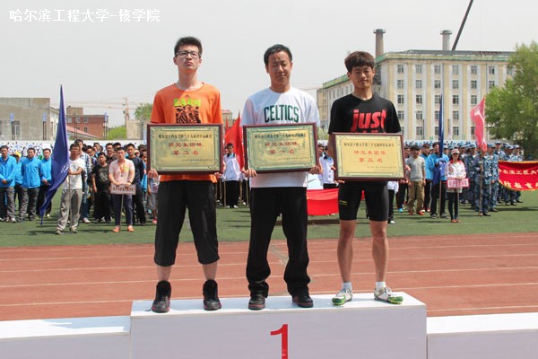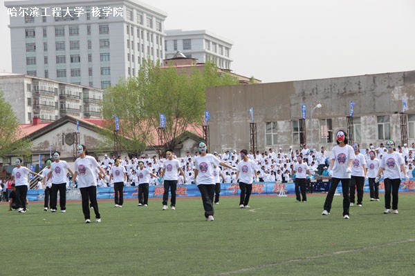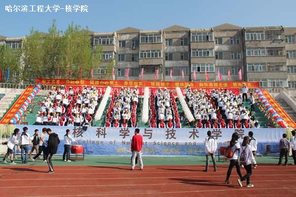 核学院在本届运动会上以“军工英才,核创未来,顽强拼搏,再创辉煌”为口号,观众席的大一、大二学生身着不同服装,变换组合成“军工 60”、“CNST”等图样,在团委、学生会学生干部的带领下,以鼓声为令,挥舞手中旗帜,动作整齐划一,阵容美观大方。核学院倡导“低碳环保”,利用废旧饮料瓶做加油棒,将环保进行到底。在一天半的时间里,大家头顶烈日,坚守方阵,充分体现了核学院学子良好的精神风貌和坚定的意志品质。