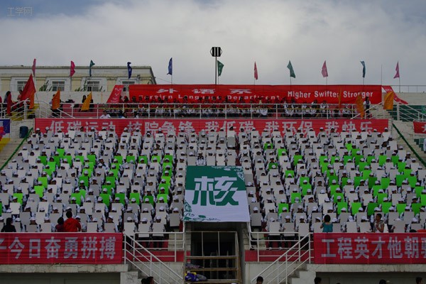 我院在此次运动会上以倡导“低碳环保”为主题,将观众方阵布置成绿色基调,以“低碳运动,核争先锋”为口号,利用废旧饮料瓶做加油棒,将环保进行到底。在运动会期间,我院观众席的450名大一、大二学生利用翻板,变换组合成“十五”以及“加油”的字样,为全校运动健儿加油,动作整齐划一,阵容美观大方,在一天半的时间里,大家头顶烈日,坚守方阵,充分体现了我院学子良好的精神风貌和坚定的意志品质。